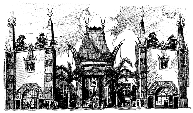 With backing supplied by movie magnate Joseph M. Schenck; C. E. Toberman, "realtor to the stars" and, quietly, Doug and Mary, Grauman set forth to outdo even himself. That he succeeded was apparent to everyone that May night as the 2,000 hand-picked guests were ushered through the theatre. They were goggle-eyed at the "bronze square-cut Pagoda roof, 90 feet above the forecourt, aged the color of green jade, underlaid by two immense piers of coral red. Beneath the piers . . . a great stone dragon, and in front of the dragon, a bronze statue symbolizing the human genius of poetry and drama while surrounding flames suggest the ever-burning fires of dramatic fancy and creation."