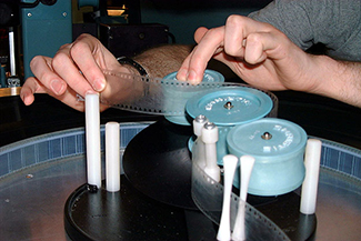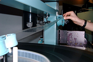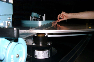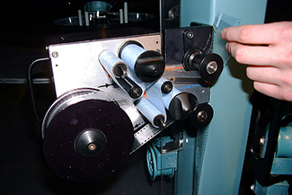 The tracks were read by a special sound head placed above the projector head as when magnetic stereo prints were first introduced. Since hardly any projectors had "feed reels" anymore because of the platter systems, the reader could be plopped on top of the Norelco's at the Chinese, and adjust the delay until it was in sync. Light streaming through the optical tracks fell upon CCDs — microchips which turned the light received into electrical impulses. The alignment of lamp, soundtracks and CCDs was critical, as any misalignment would wreak havoc on the CCDs ability to read the tracks. We do not know what was used for noise reduction; dbx probably.