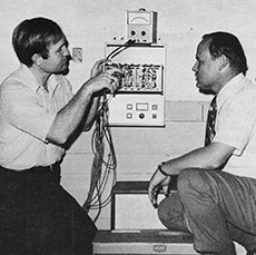 Academy Award Theatre, Los Angeles California. Robert Leonard and Richard Stumpf with the Sensurround Control Unit in the projection room, 1974. From American Cinematographer, November 1974, "Sensurround."