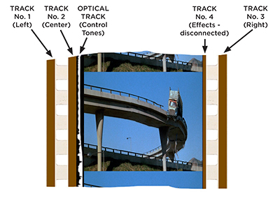 The next step would be: how do we trigger the Control Unit for when we want it to make some noise? It was decided to utilize the optical soundtrack on the 35mm 4-track magnetic print. Since 1957 or so, this had been known as a “magoptical” print: the optical track carried a film’s stereo tracks in mono, so that the print could be run on a projector with only optical sound heads (provided that the projector had the smaller “Fox Hole” sprockets installed).